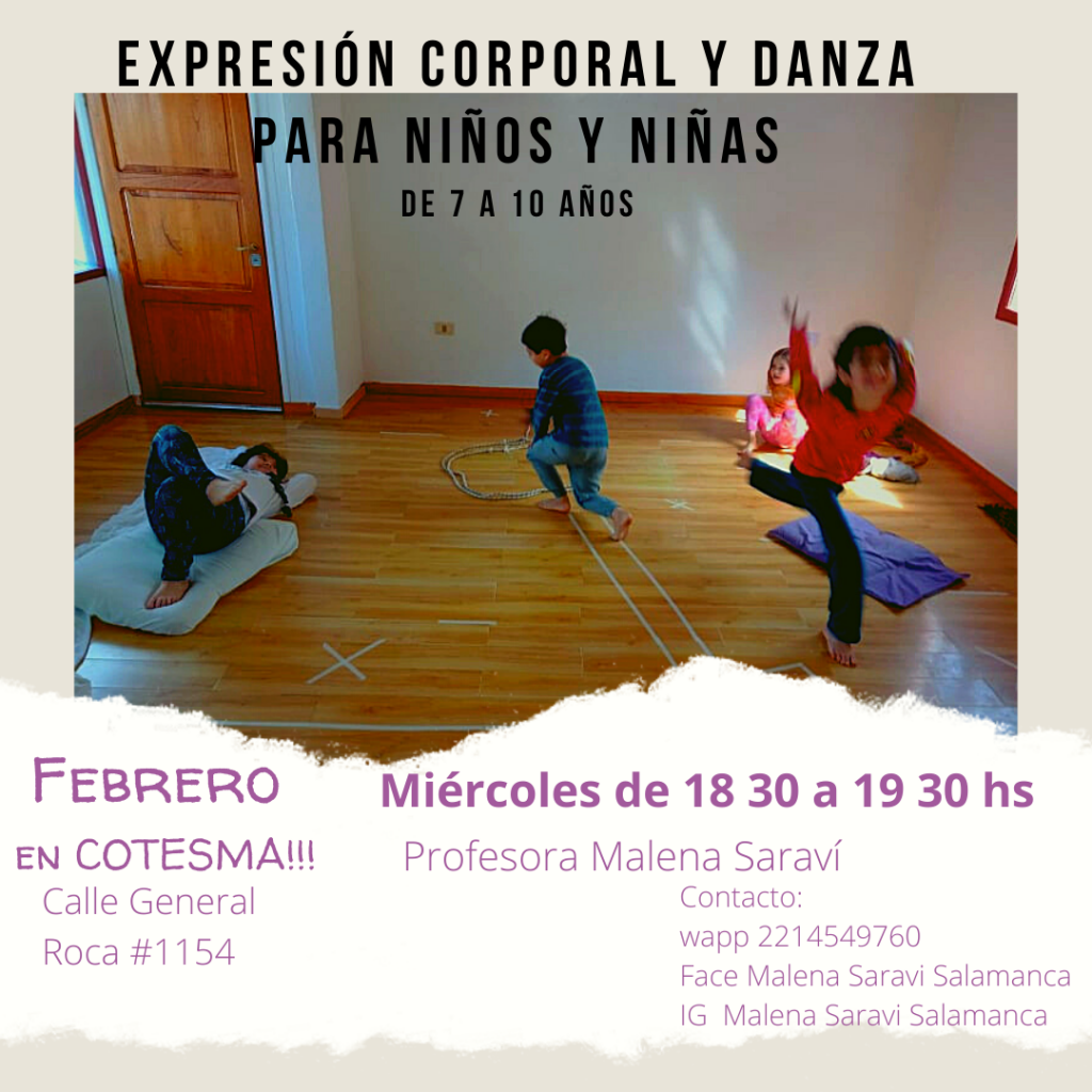 Con todos los protocolos sanitarios vigentes para tu seguridad y la nuestra, la Docente y Bailarina intérprete en Danza Contemporánea (Egresada de la Escuela de Danzas Clásicas de La Plata), Malena Saravi Salamanca, realizará un Taller de Expresión Corporal y Danza para Niños.
