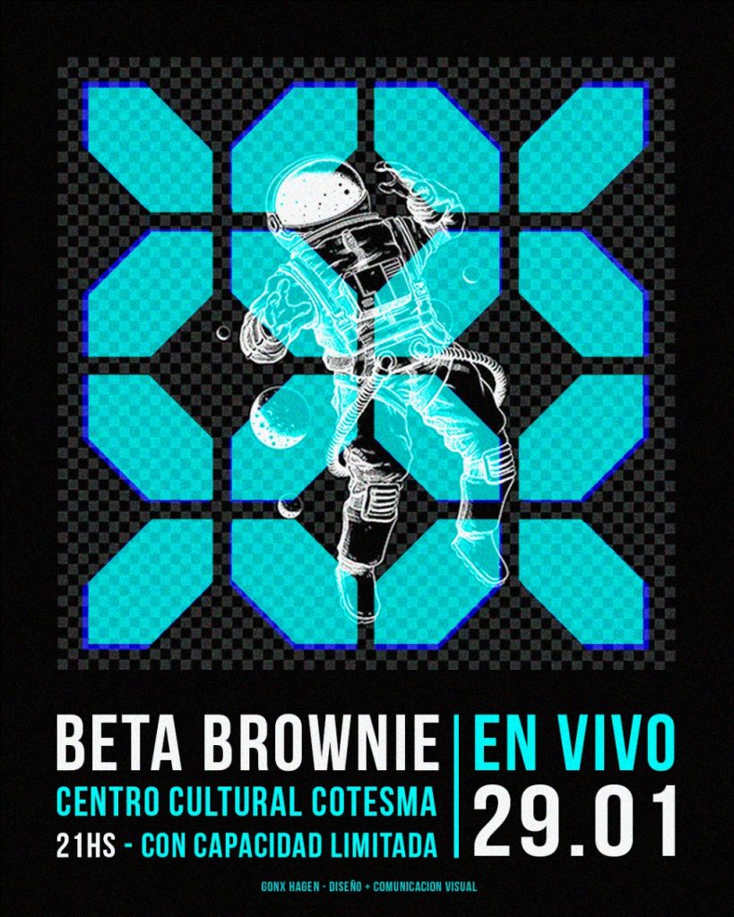 Beta Brownie es una banda de origen patagónico, que combina estilos a la vez bailables, viajeros y psicodélicos. Con un sonido tanto acústico como electrónico, el proyecto fusiona dub, reggae, ska, disco y techno. Su show en vivo se destaca por ser tripero y enérgico, con algunos pasajes instrumentales de alto vuelo y otras canciones cantadas de corte más bailable. La base de Beta Brownie es un potente combo de batería, bajo, teclado y bases electrónicas; a lo que se suman las voces y una melódica sección de vientos: trompeta, trombón y saxo. Bandas como Fat Freddy`s Drop, The Cat Empire y Panda Dub han sido influencias del proyecto.