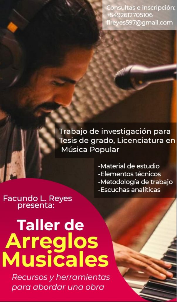 Hola gente de San Martin!! Tengo el agrado de compartirles el fruto del proyecto de investigación, de autoría propia para la tesis de grado de la Lic. En Música popular FAD UnCuyo (Mendoza). Mi propósito es llevarlo a la práctica mediante la realización de un taller y mi deseo, ofrecerlo en este lugar. Dicho taller está destinado a músicxs, docentes y estudiantes, con ganas de incursionar en el mundo de los arreglos musicales y experiencia en tocar instrumentos (canto, guitarra, piano, percusión, vientos, etc), ya sea de manera solista o en banda-ensamble. Será llevado a cabo en el teatro San José los días viernes 26/02 y 05/03 a las 11:30hs, con los protocolos correspondientes y cuidandonos entre todxs. Consta de dos encuentros de 2hs c/u. Interesados comunicarse al +5492612705106 o flreyes597@gmail.com o facu4447 en Instagram. Inscripción abierta hasta el 22 de febrero. CUPOS LIMITADOS. Se agradece su presencia y difusión, saludos cordiales!