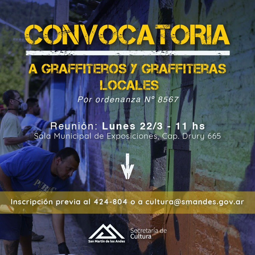 La Secretaría de Cultura invita a graffiteros y graffiteras locales a participar de una reunión, el día lunes 22 de marzo a las 11 hs, en la Sala Municipal de Exposiciones Lidaura Chapitel, con el objetivo de recibir sugerencias en relación a la Ordenanza Nº 8567/2009.