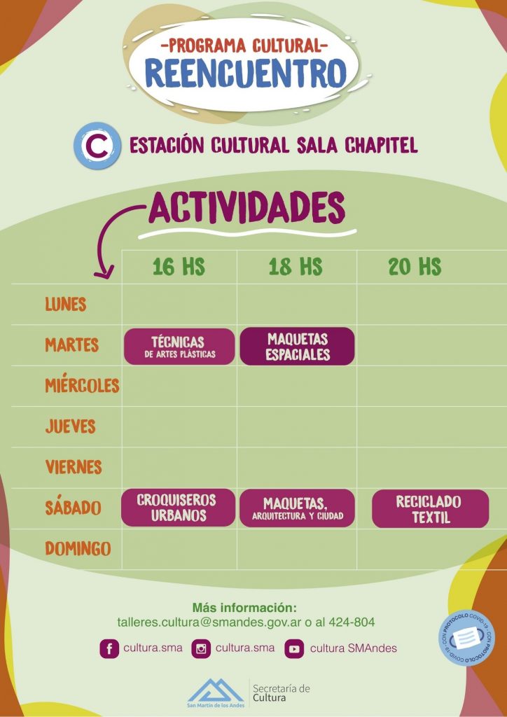Reciclado textil: sábado a las 20 hs. Coordinado por la diseñadora en indumentaria Adriana Espinosa, el taller de reciclado textil propone desde una mirada artística y práctica darle nueva vida a prendas que ya no utilizamos. La actividad está destinada a jóvenes y adultos.
