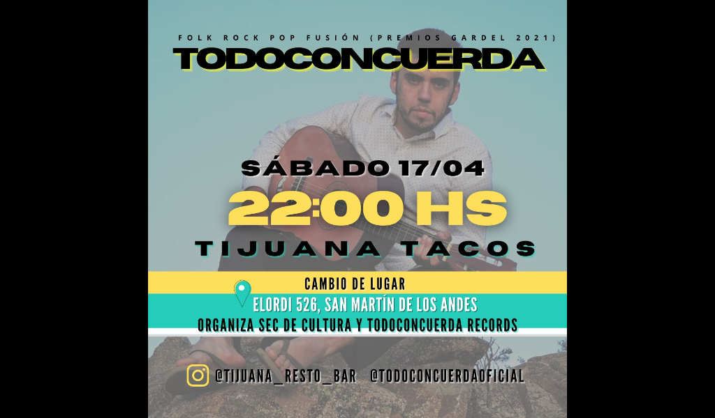 - Sábado 17 de abril; TODOCONCUERDA a las 22hs. en TIJUANA TACOS (Elordi 526)