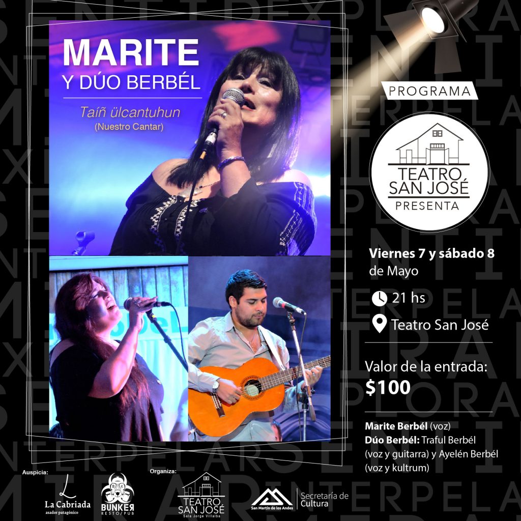 En esta oportunidad, tenemos el agrado de recibir a Marite y dúo Berbel en dos funciones: viernes 7 y sábado 8 de mayo a las 21hs. Invitamos a la comunidad a disfrutar de esta propuesta característica de nuestros paisajes, testimonios, y maneras de ser Patagónicos.