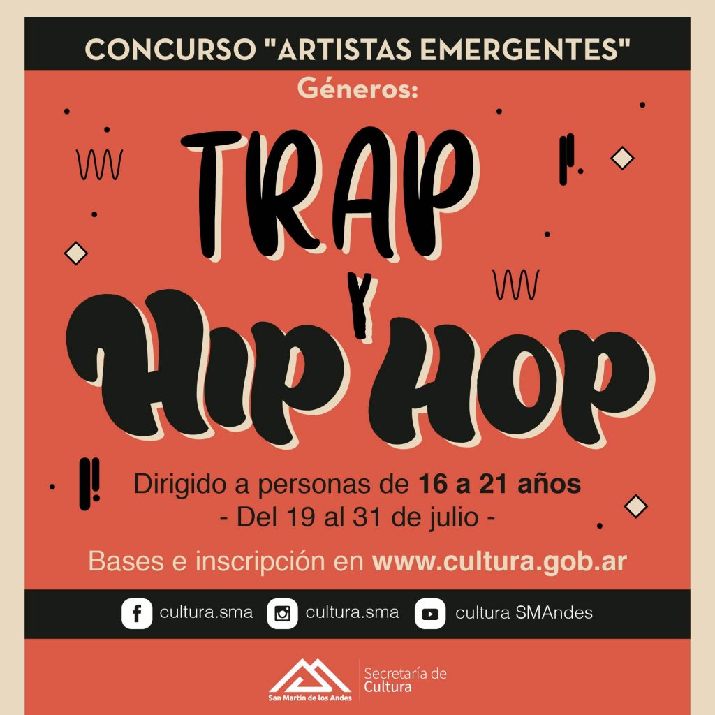 La Secretaria de Cultura de San Martín de los Andes abre la inscripción al concurso “Artistas Emergentes: géneros hip-hop y trap”, con el objetivo de visibilizar y promocionar a artistas jóvenes de la localidad que desarrollen esos géneros musicales.