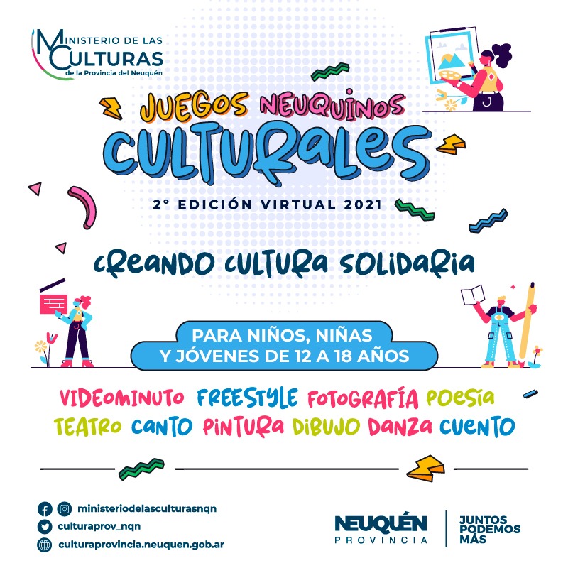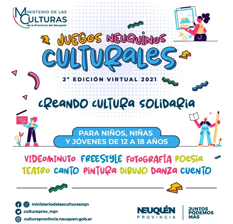 Los “Juegos Neuquinos Culturales”, son un programa permanente del Ministerio de las Culturas, el programa federal de arte joven más importante de toda la provincia, que contará con una instancia Local/Provincial y la participación de las y los jóvenes seleccionados finalistas, que representarán a la provincia en la instancia nacional a desarrollarse de manera virtual a través de encuentros en talleres, conversatorios y clínicas de capacitación.