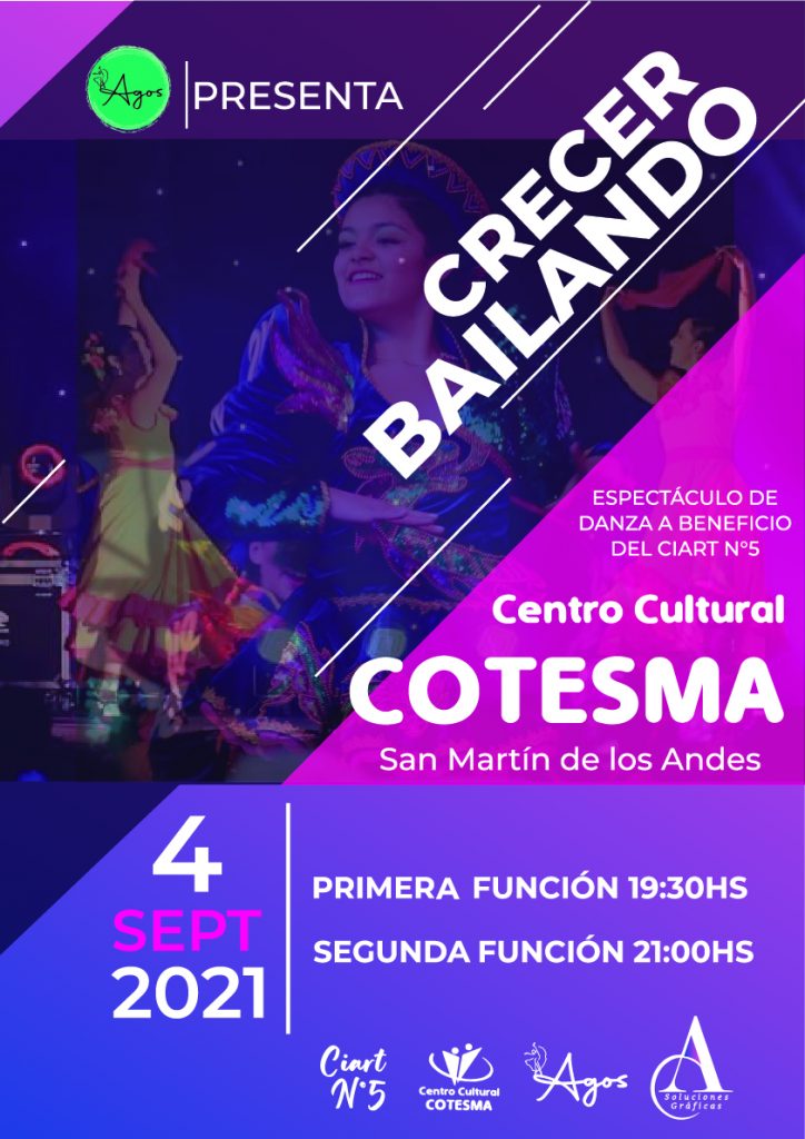 El sábado 04 de septiembre a las 19:30hs y a las 21hs, llegan dos funciones de “CRECER BAILANDO” un espectáculo a beneficio del C.I.Art N°5 de nuestra localidad.