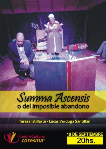 El próximo domingo, 19 de septiembre a las 20:00hs en la Sala Amankay de nuestro querido Centro Cultural, disfrutaremos la obra “SUMMA ASCENSIS, O DEL IMPOSIBLE ABANDONO”, escrita e interpretada por Teresa Istillarte y Lucas Verduga Santillán.