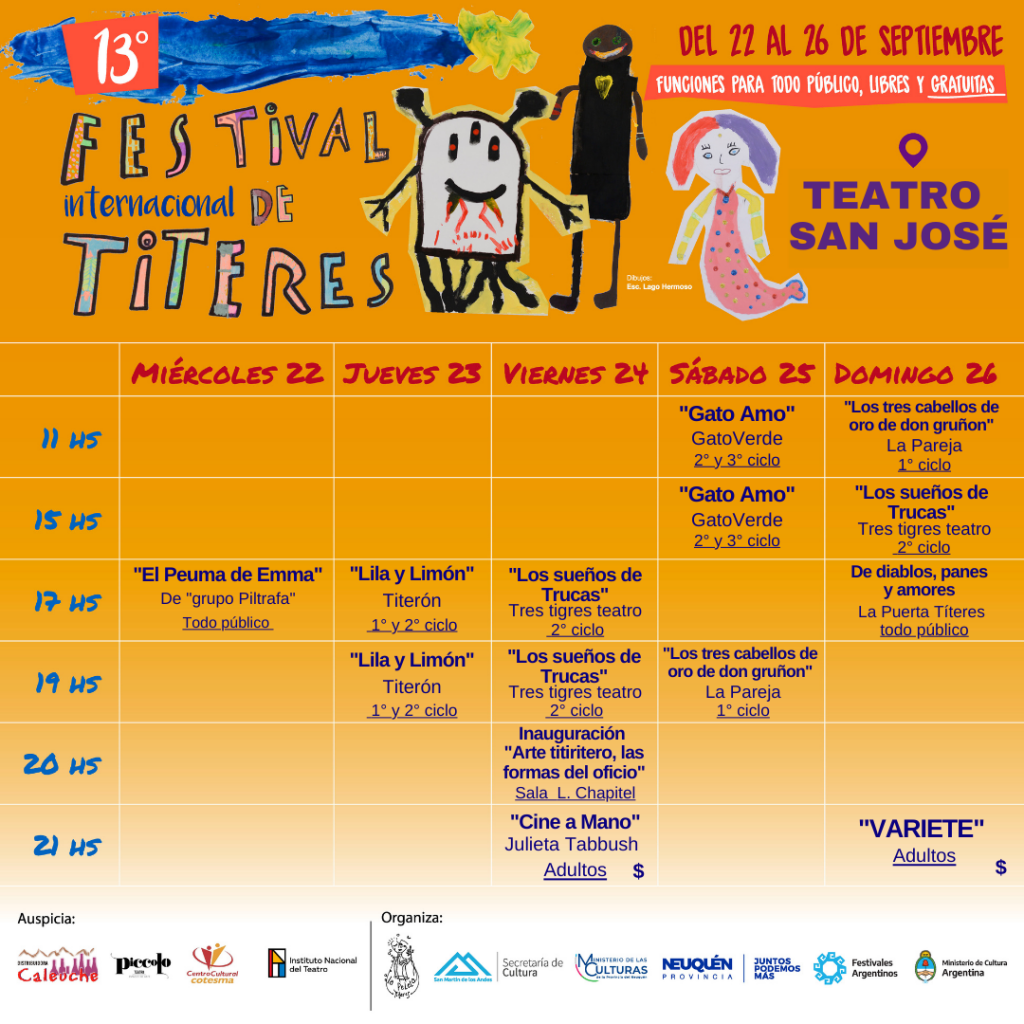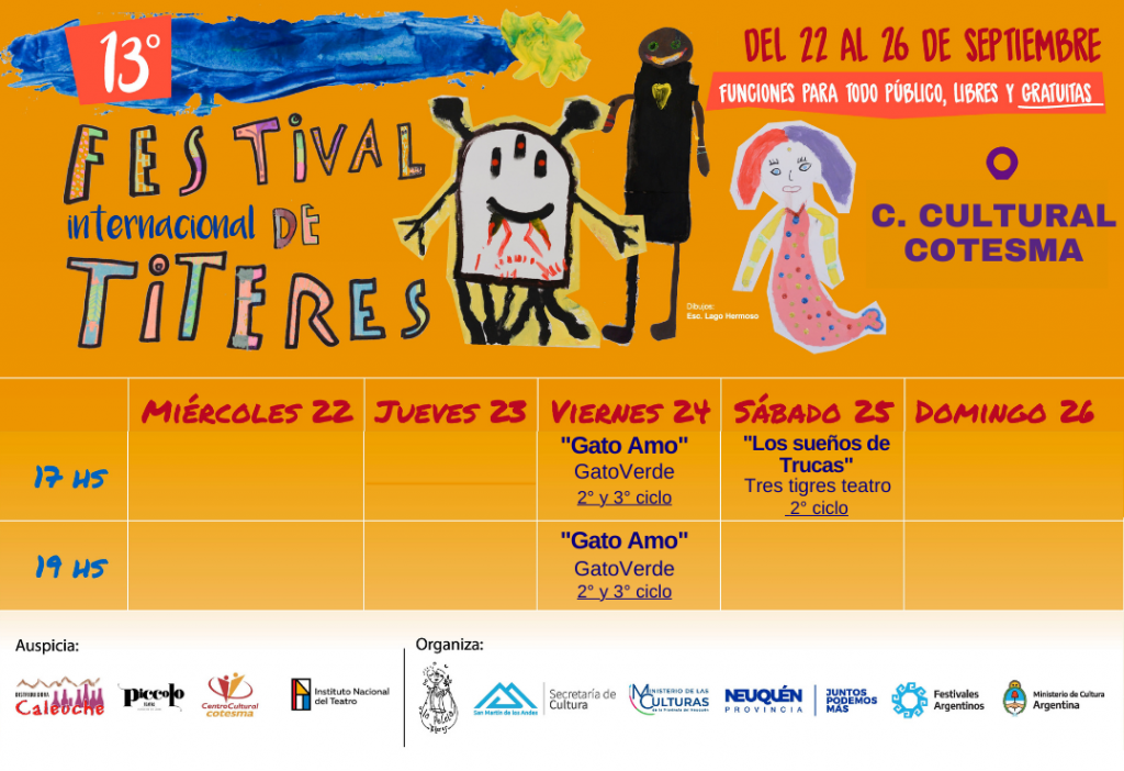 La 13º edición de este importante evento es organizada por la Secretaría Municipal de Cultura junto a La Pelela Títeres, y cuenta con el acompañamiento del Ministerio de las Culturas de la Provincia del Neuquén, el Instituto Nacional del Teatro y el Programa Festivales Argentinos del Ministerio de Cultura de la Nación.