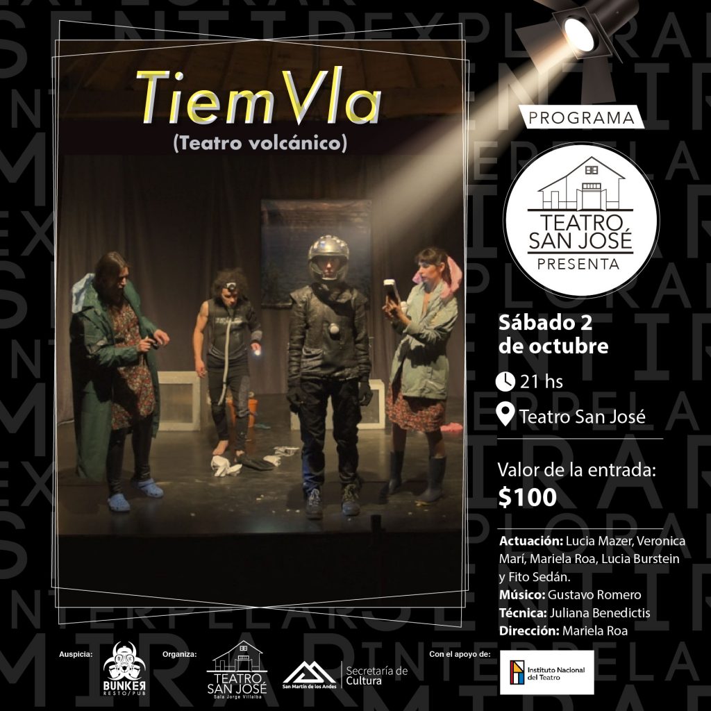El próximo sábado 2 de octubre, a las 21hs, el teatro San José vuelve a abrir sus puertas para un nuevo estreno, está vez de la mano de la obra TiemVla. Como en cada edición de este programa, las entradas se encuentran a la venta en la boletería del teatro, a precio promocional de $100. Se pueden retirar de 9 a 21hs.