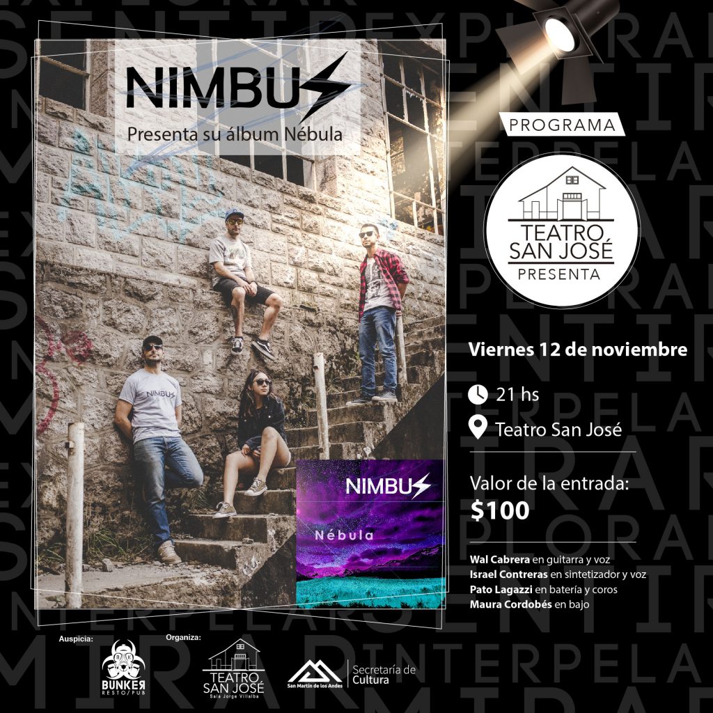 El próximo viernes 12 de noviembre, a las 21hs, Nimbus pesenta su nuevo disco en el teatro San José, en un espectáculo que forma parte del programa iniciado a principios de este año, con el propósito de fomentar el acceso a obras y shows con entradas a precio promocional.