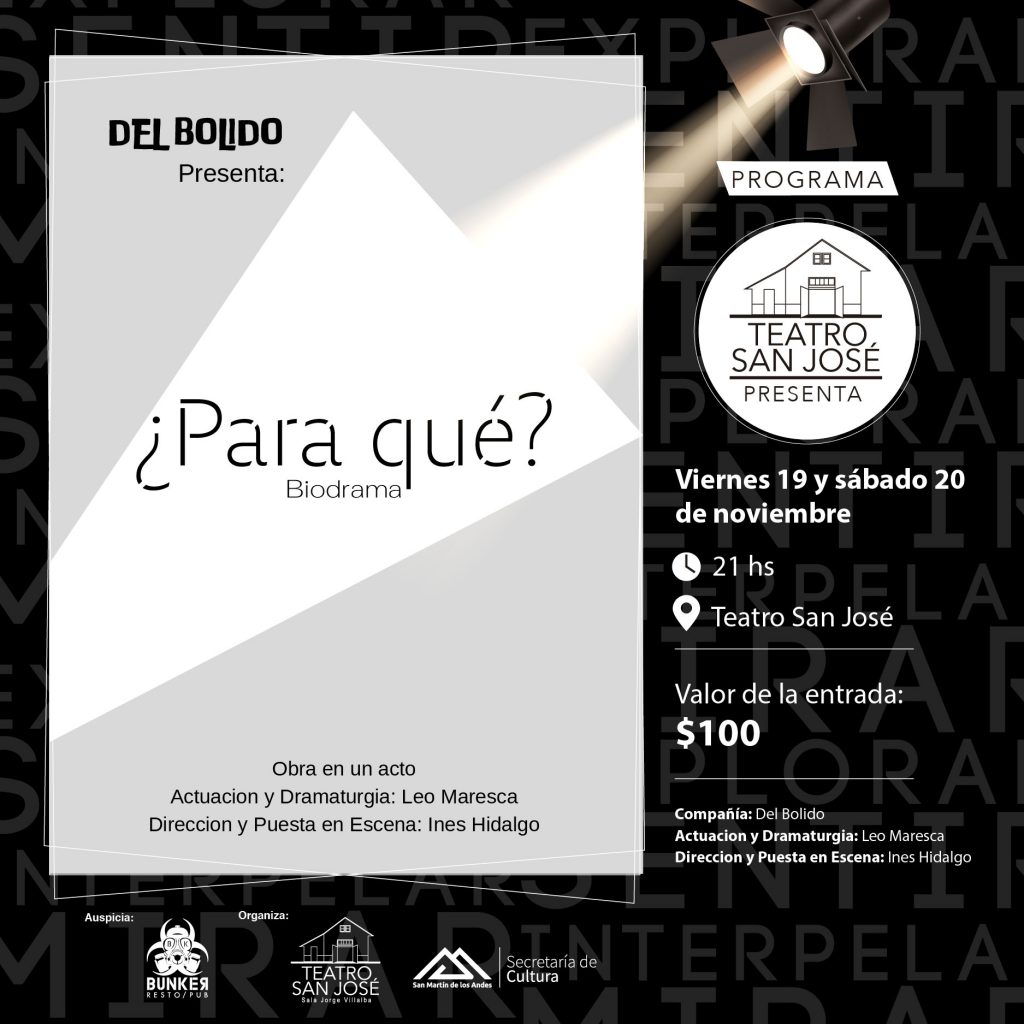 El próximo viernes 19 y sábado 20 de noviembre, a las 21hs, el Teatro San José Presenta una nueva producción teatral: “¿Para Que?”. Las entradas cuentan con valor promocional y se adquieren en la boletería del teatro.
