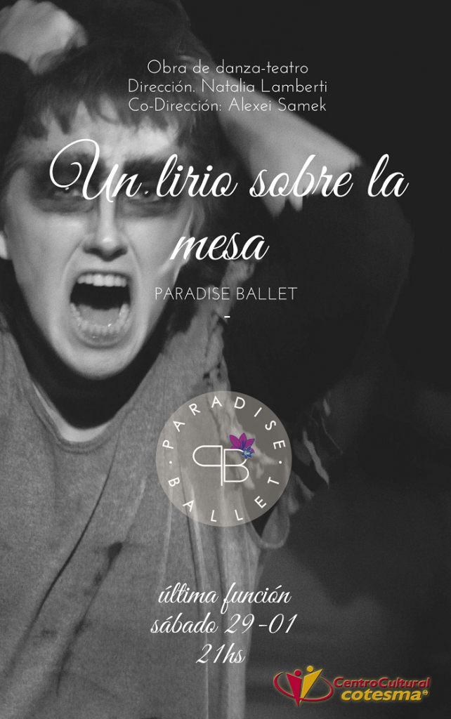 El próximo sábado, 29 de enero a las 21hs, Paradise Ballet vuelve al Centro Cultural Cotesma con su primera presentación del año. Esta vez, la compañía de danza contemporánea nos deleitará con su creación “Un Lirio Sobre La Mesa”. Una obra dramática en la cual podremos observar el comportamiento y desarrollo de distintos personajes a lo largo de la historia.