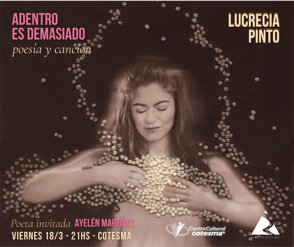 El próximo viernes 18 de marzo a las 21 hs en la Sala Amankay del Centro Cultural Cotesma, volveremos a disfrutar otra imperdible noche artística y cultural. La cantante y productora Lucrecia Pinto presenta “ADENTRO ES DEMASIADO”, su espectáculo íntimo de música y poesía de la mano de La Ria Producciones.