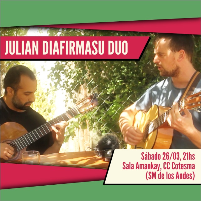El próximo sábado, 26 de marzo, en nuestra querida Sala Amankay, seguimos disfrutando las mejores presentaciones. A las 21hs es el turno de JULIÁN DIAFIMARSÚ con algunos invitados especiales.
