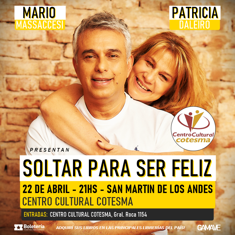 El próximo viernes, 22 de Abril, a las 21hs en la Sala Amankay del Centro Cultural Cotesma, recibiremos a Mario Massaccesi y Patricia Daleiro que nos contarán cómo, desde historias trágicas de sus vidas, pudieron “SOLTAR PARA SER FELIZ”.