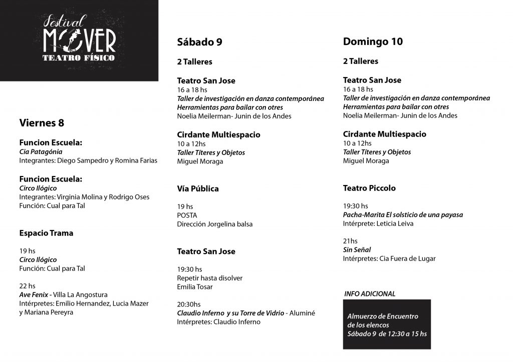 Ciudad Cultural, Ultimas noticiasGrilla del ”FESTIVAL MOVER- Teatro Físico”, en San Martín de los Andes Compartimos la grilla completa del ”FESTIVAL MOVER- Teatro Físico” que se desarrollará en diversas locaciones.