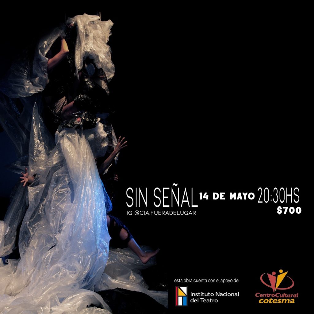 La compañía FUERA DE LUGAR se conformó en el año 2020 dentro del contexto de pandemia, la cual impactó profundamente en las ideas y formas de creación. El motor de ese encuentro fue poner a dialogar distintos lenguajes artísticos al servicio de una experimentación que permitiera atravesar la realidad que se presentaba. Sus integrantes son Maite Arana, Sol Lence, Romina Farias, Denise Francese y Stefania Mateu quienes residen actualmente en la ciudad de San Martín de los Andes. La obra “SIN SEÑAL” es una creación colectiva gestada a través de diferentes visiones en base a un disparador que nos atravesaba en ese momento. Esta obra cuenta con el apoyo del INT (Instituto Nacional de Teatro) y con la dirección de Jorgelina Balsa.