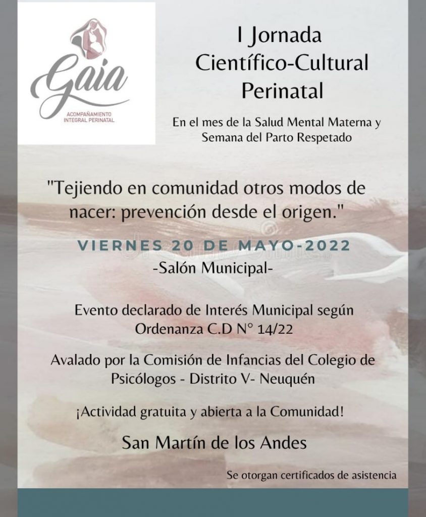“I JORNADA CIENTÍFICO-CULTURAL PERINATAL” en San Martín de los Andes. Actividad abierta y gratuita para todas las familias, profesionales y comunidad. A realizarse el Viernes 20 de Mayo del 2022 en el salón Municipal desde las 9 hs.