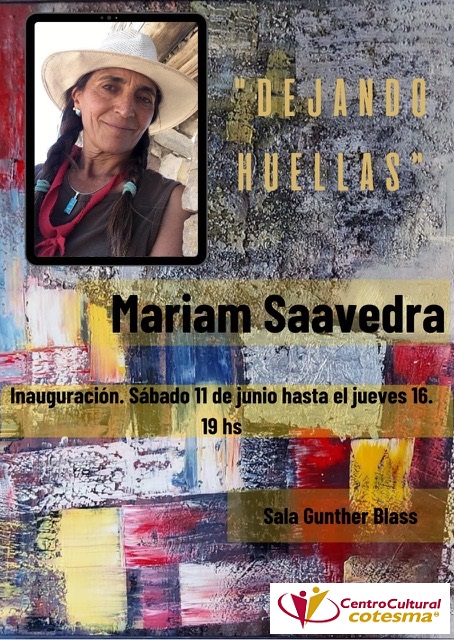 El próximo sábado, 11 de junio a las 19hs, en la Sala Günther Blaas, con un vernissage quedará inaugurada la Muestra “DEJANDO HUELLAS” de la artista plástica Mariam Saavedra.