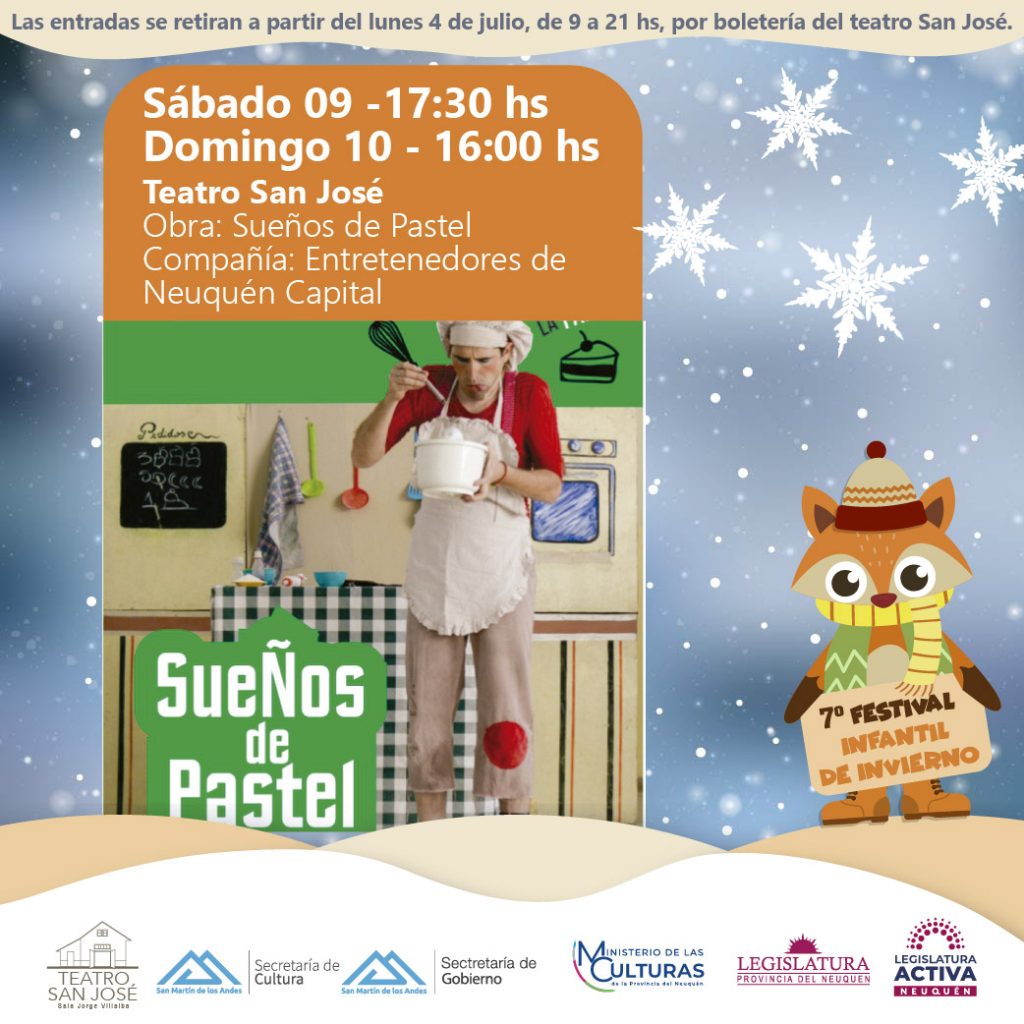 “Este Sábado 9 de julio te esperamos en la inauguración de la Séptima edición del Festival Infantil de Invierno. En esta ocasión, Los Entretenedores nos vienen a presentar a nuestra localidad su obra Sueños de Pastel, a las 17:30 hs. En el Teatro San José. Te contamos un poquito de que se trata, pero solo un poquito, porque el resto tenés que verlo vos: