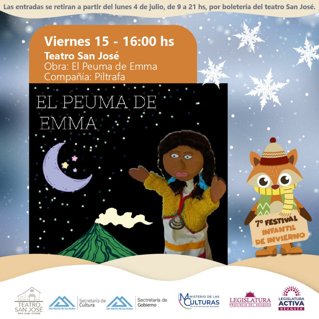 “Teatro de títeres con la compañía Piltrafa nos traen la historia de una niña que sueña con la búsqueda de sus raíces, pero para encontrarla deberá adentrarse en los misteriosos bosques del sur, en las profundidades de la tierra y viajar mas allá de las nubes. Deberá ella ser muy valiente, para las aventuras que le aguardan y que compartiremos con ustedes”