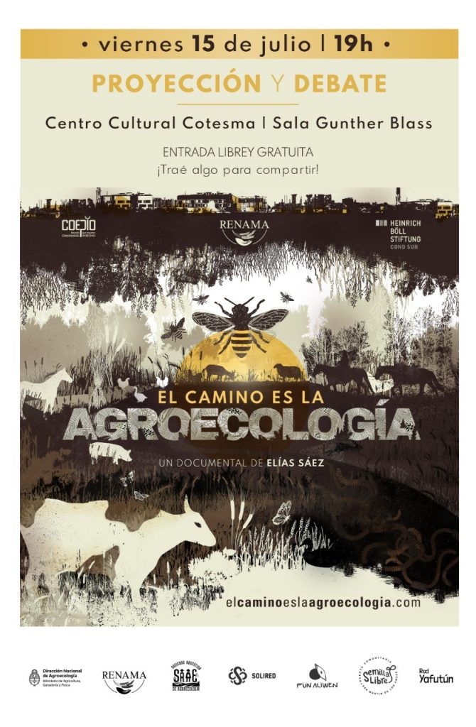 El próximo viernes, 15 de Julio, a las 19hs en la Sala Gúnther Blaas, Renama, Solired, Fin Aliwen, Semilla Libre y la Red Yafutun, van a llevar a cabo la proyección, libre y gratuita, del documental “EL CAMINO ES LA AGROECOLOGÍA”.