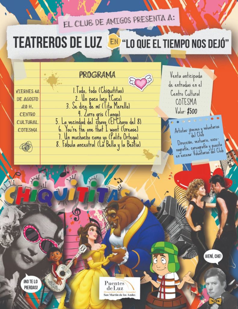 El Club de Amigos de Puentes de Luz presentará la obra “Lo que el tiempo nos dejó”. Los artistas, integrantes del grupo Teatreros de Luz, realizan un viaje en tiempo en el que, a través de la música se pasean por aquellos buenos viejos tiempos.