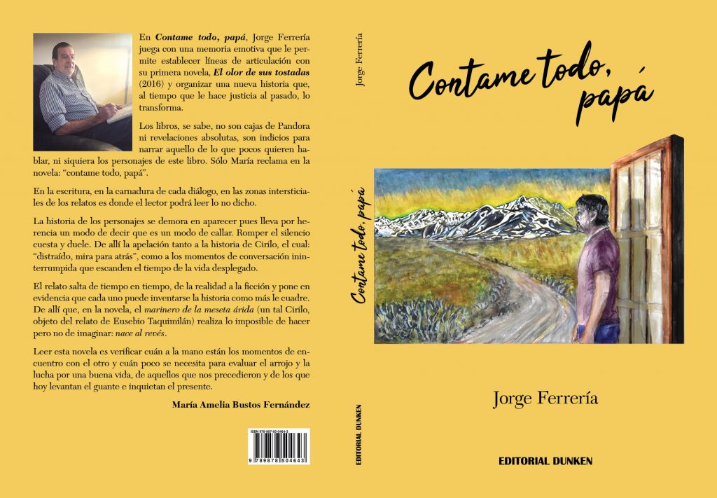 “En Contame todo, papá, Jorge Ferrería juega con una memoria emotiva que le permite establecer líneas de articulación con su primera novela, El olor de sus tostadas (2016) y organizar una nueva historia que, al tiempo que le hace justicia al pasado, lo transforma. Los libros, se sabe, no son cajas de Pandora ni revelaciones absolutas, son indicios para narrar aquello de lo que pocos quieren hablar, ni siquiera los personajes de este libro. Sólo María reclama en la novela: “Contame todo, papá”. En la escritura, en la carnadura de cada diálogo, en las zonas intersticiales de los relatos es donde el lector podrá leer lo no dicho. La historia de los personajes se demora en aparecer pues lleva por herencia un modo de decir que es un modo de callar. Romper el silencio cuesta y duele. De allí la apelación tanto a la historia de Cirilo, el cual: “distraído, mira para atrás”, como a los momentos de conversación ininterrumpida que escanden el tiempo de la vida desplegado. El relato salta de tiempo en tiempo, de la realidad a la ficción y pone en evidencia que cada uno puede inventarse la historia como más le cuadre. De allí que, en la novela, el marinero de la meseta árida (un tal Cirilo, objeto del relato de Eusebio Taquimilán) realiza lo imposible de hacer, pero no de imaginar: nace al revés. Leer esta novela es verificar cuán a la mano están los momentos de encuentro con el otro y cuán poco se necesita para evaluar el arrojo y la lucha por una buena vida, de aquellos que nos precedieron y de los que hoy levantan el guante e inquietan el presente.”