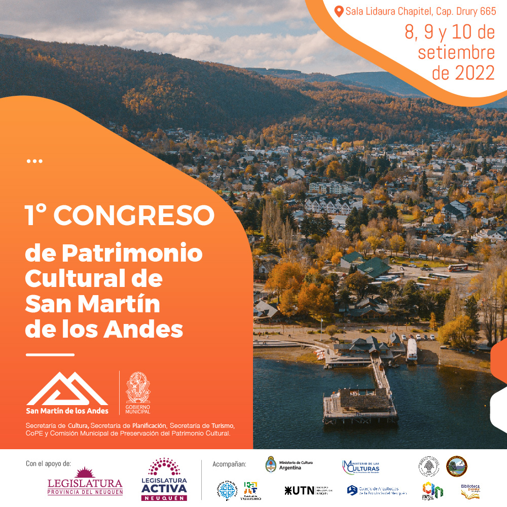 La Secretaría de Cultura y Educación invita a la comunidad a participar en el 1º Congreso de Patrimonio Cultural de San Martín de los Andes, que se realizará el 8, 9 y 10 de septiembre de 2022 en la sala Lidaura Chapitel.