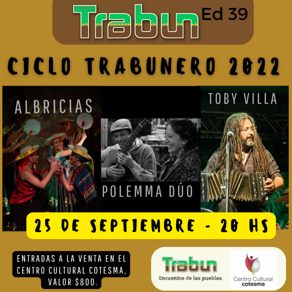 El próximo domingo, 25 de septiembre a las 20hs, en nuestra querida Sala Amankay, disfrutaremos el Primer “CICLO TRABUNERO” del año, realizado por la Comisión Organizadora del Trabún.