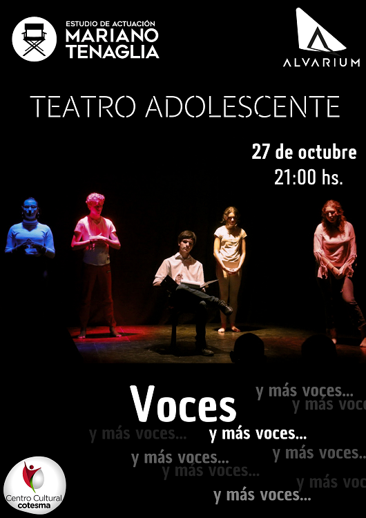 El próximo jueves, 27 de octubre a las 21hs, en la Sala Amankay, en el marco del Ciclo de Teatro Adolescente, organizado por el Estudio de Actuación Mariano Tenaglia, de la mano de la Escuela del Sol y el Centro Cultural Cotesma, llega “VOCES Y MÁS VOCES”.