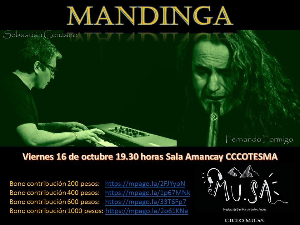 “Mandinga” es un dúo que reside en San Martín de los Andes (Neuquén Argentina) formado por Fernando Formigo en quena y Sebastián Cenzano en piano (ambos docentes de la Escuela Superior de Música San Martín de los Andes), abordamos un repertorio de música popular argentina, pero sobre todo la música del Maestro Astor Piazzolla, y de este último piezas con poca difusión.
