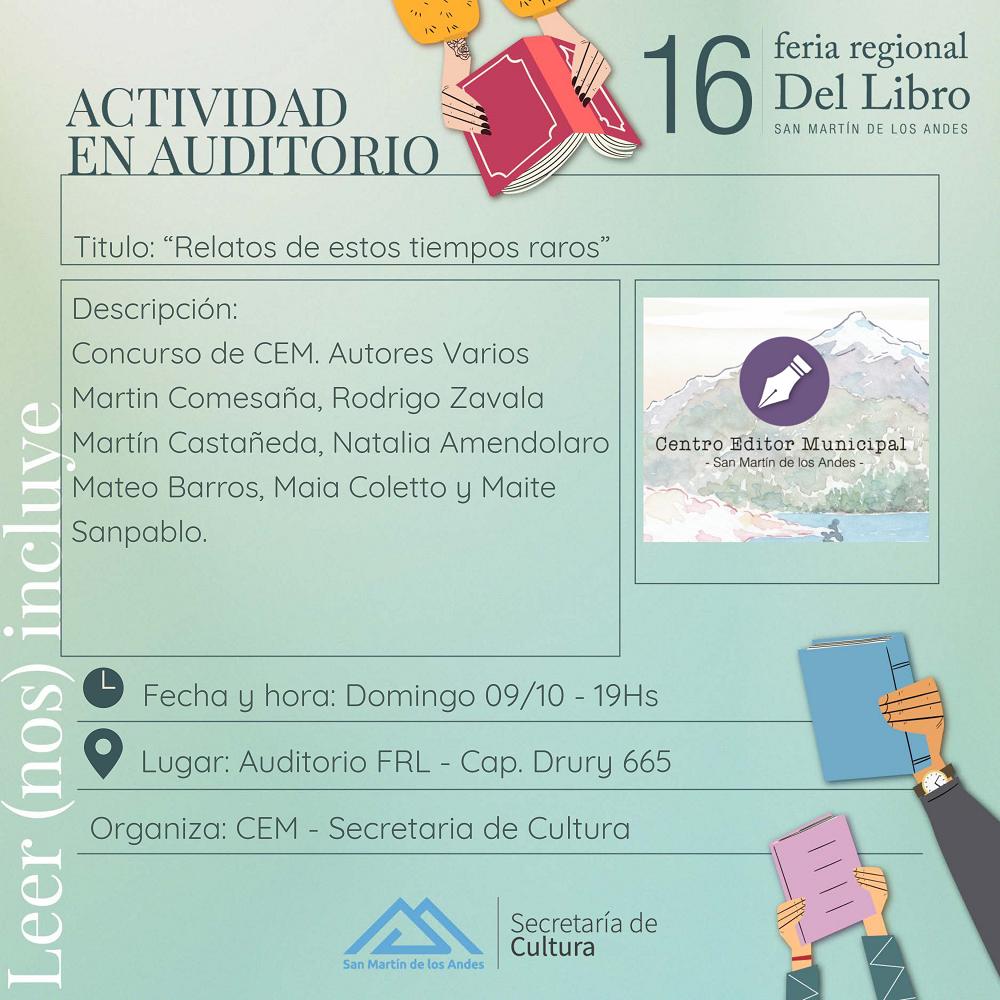 - 19:30: Presentación del libro ”Relatos de estos tiempos raros”. Ganadores del Centro Editor Municipal 2022. Organiza: Centro Editor Municipal, Secretaría de Cultura.