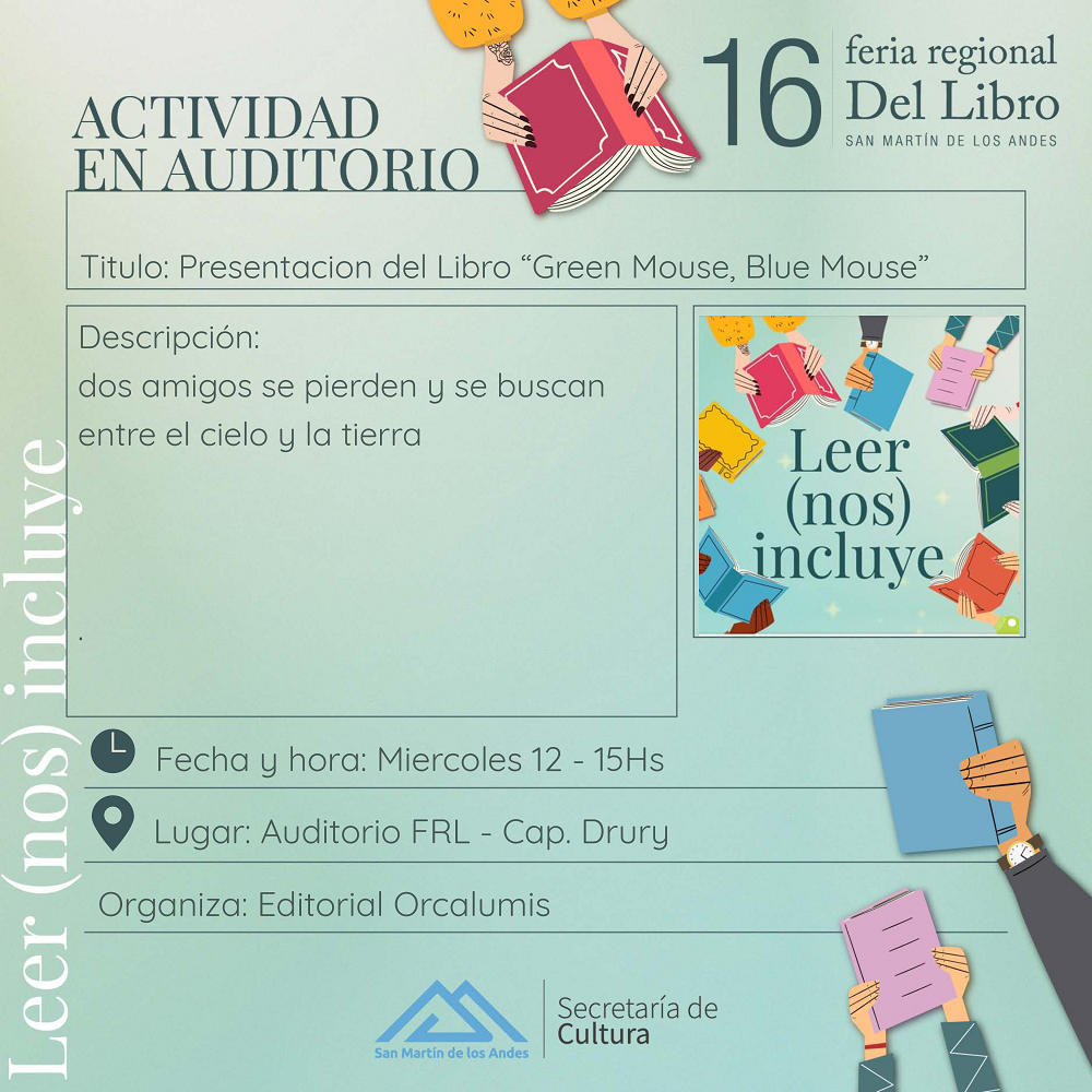 - 15 hs. María Cristina Venturini. Presentación del libro ”Green mouse, blue mouse”. Organiza Editorial Orcalumis.