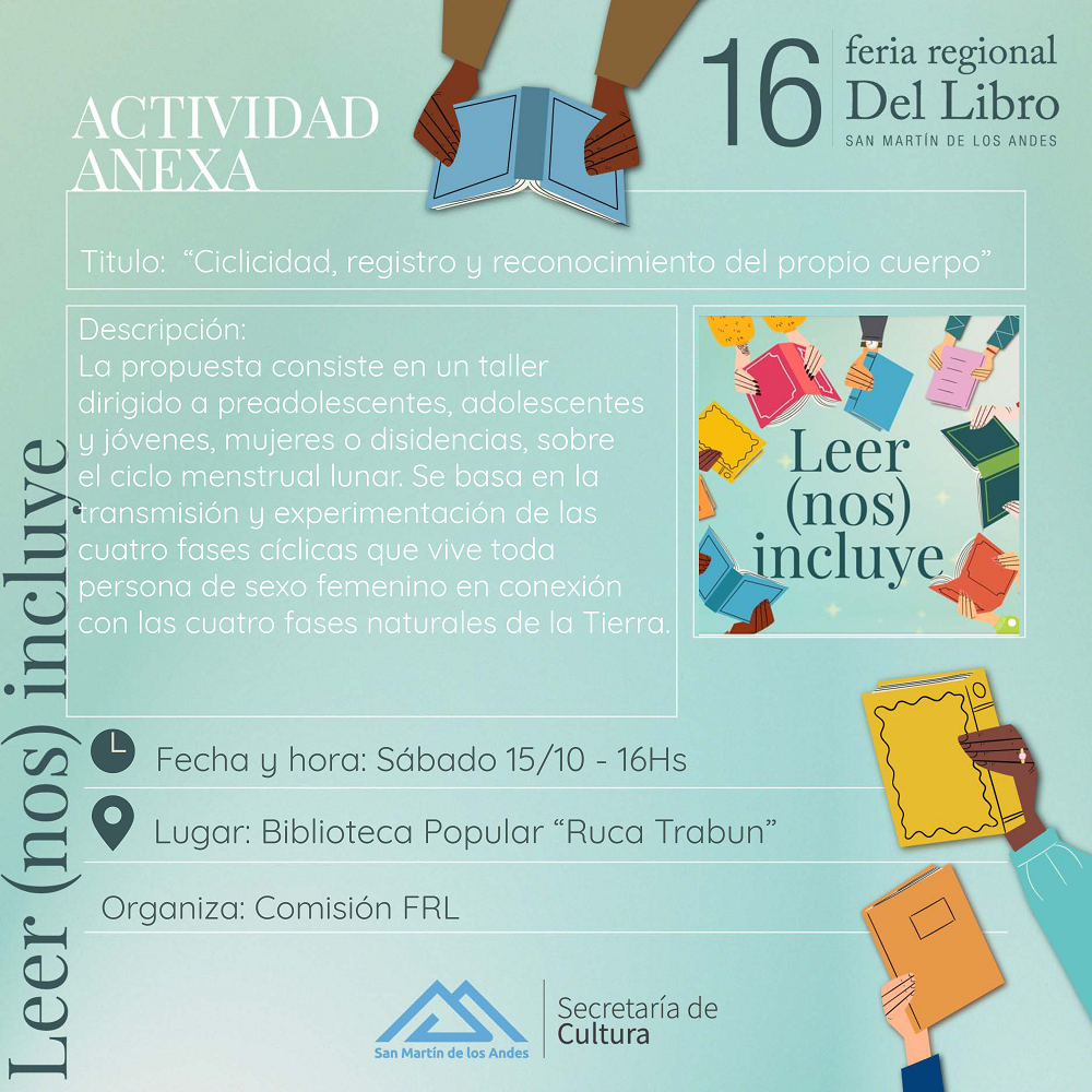 - Sábado 15 – 16 hs. Biblioteca Popular Ruca Trabun. Zoe Piccirilli y Eleonora Gómez. Taller ”Registro y reconocimiento del propio cuerpo. Cómo vivir la ciclicidad menstrual de manera ecológica y saludable”. Inscripciones al mail rucatrabunbiblioteca@gmail.com