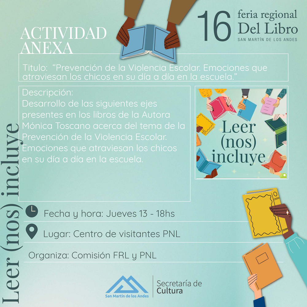 - Jueves 13 – 18 hs. Centro de visitantes del Parque Nacional Lanín. María Marta Ruggieri, e Isabel Totah. Taller ”Prevención de la violencia escolar. Emociones que atraviesan los chicos en su día a día en la escuela. Método Mónica Toscano – Prevention In Act.