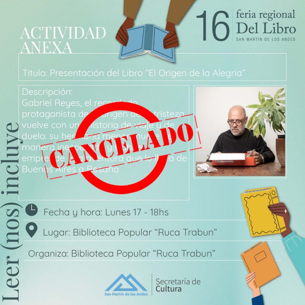 - Sábado 15 – 18 hs. Biblioteca Popular Ruca Trabun. Jeremías Neumeyer, ”El escritor maldito. 10 años de maldición”.