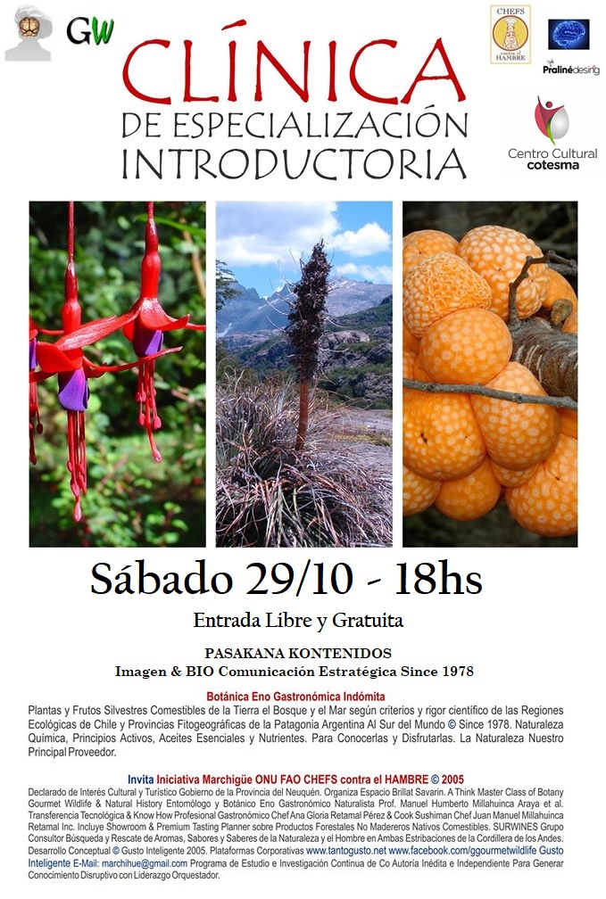 El próximo sábado, 29 de octubre de 18hs a 22hs en la Sala Günther Blaas de nuestro querido Centro Cultural Cotesma, PASAKANA KONTENIDOS Imagen & BIO Comunicación Estratégica Since 1978 presenta su imperdible “CLÍNICA DE ESPECIALIZACIÓN INTRODUCTORIA EN BOTÁNICA GASTRONÓMICA”.