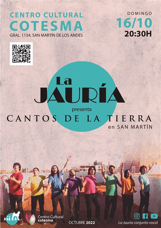 Este domingo, 16 de octubre, regalale a tu mamá una imperdible noche de espectáculo en la Sala Amankay. A las 20:30hs, La Jauría, conjunto vocal compuesto por ocho cantantes y un director de puesta en escena, estudiantes de música del Instituto Universitario Patagónico de Artes (IUPA) en General Roca (Río Negro), presentan “CANTOS DE LA TIERRA”.