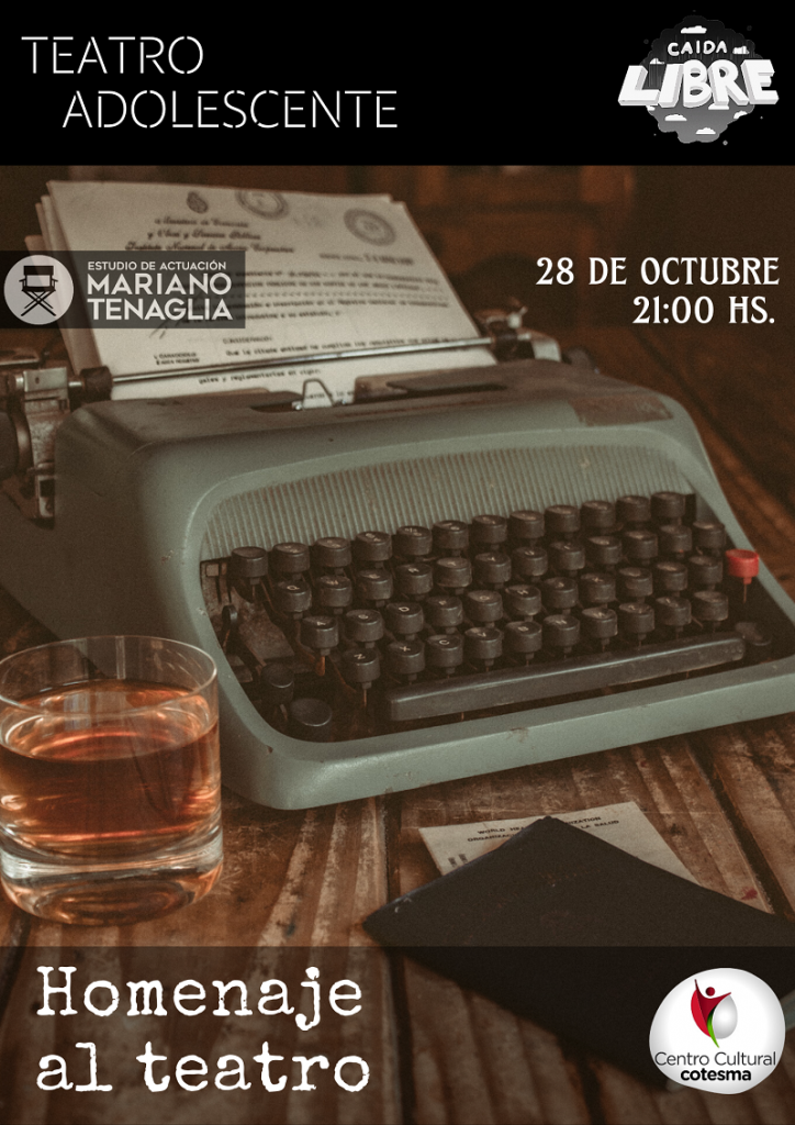 El viernes, 28 de octubre a las 21:00hs, en nuestra querida Sala Amankay, la compañía de teatro adolescente “Caída Libre” del “Estudio de Actuación Mariano Tenaglia” presenta “HOMENAJE AL TEATRO”, un recorrido por algunos de los personajes y situaciones más emblemáticas del teatro argentino.