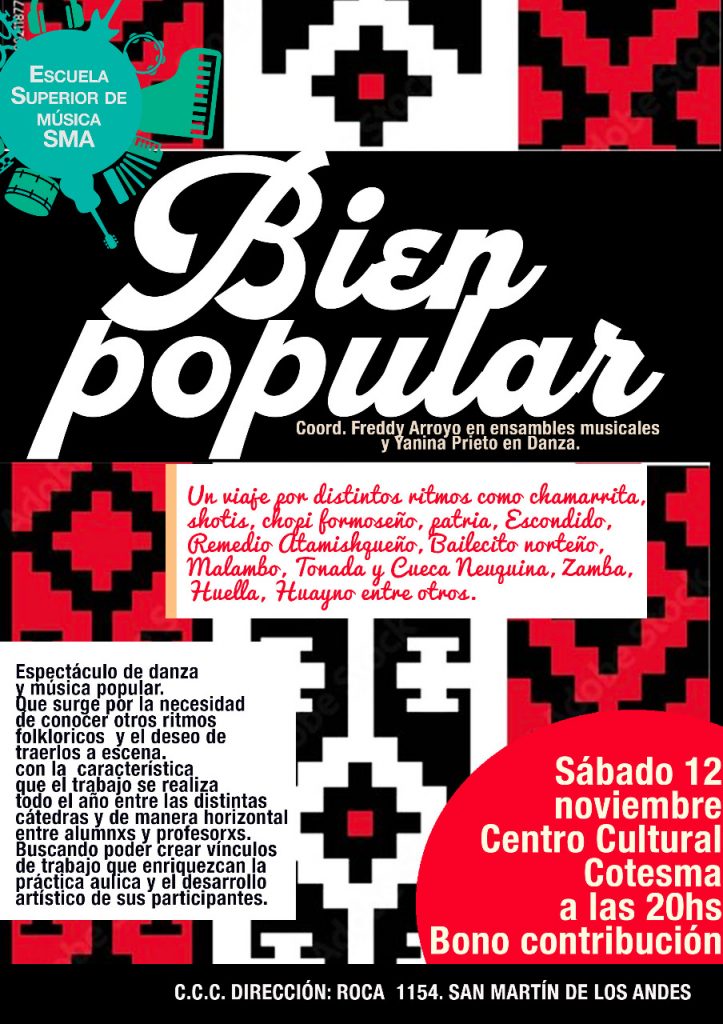 “Bien Popular” es un espectáculo de danza y música popular de la Escuela Superior de Música de San Martin de los Andes, que surge por la necesidad de conocer otros ritmos folclóricos y el deseo de traerlos a escena.