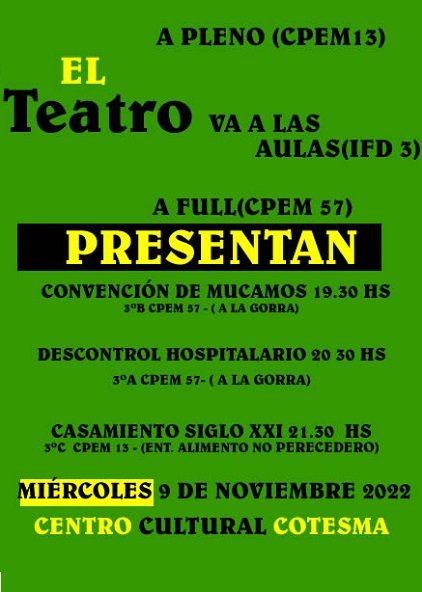El próximo miércoles, 09 de noviembre a las 19:30hs, en la Sala Amankay de nuestro querido Centro Cultural, compartiremos tres obras teatrales en el marco del Proyecto “EL TEATRO VA A LAS AULAS”. Las mismas son realizadas por estudiantes de 3° año Tuno Noche del CPEM N°57 y del CPEM N°13.