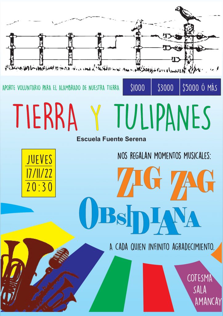 El próximo jueves, 17 de noviembre a las 20:30ha en la Sala Amankay del Centro Cultural Cotesma se realizará el Evento Musical “TIERRA Y TULIPANES”, organizado por la Asociación Mutual de la Escuela Fuente Serena.