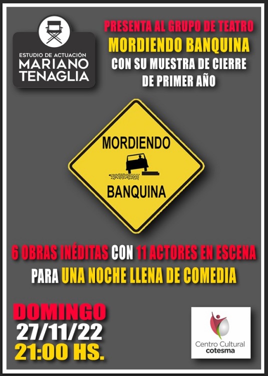 Y a las 21hs, es el turno del Grupo “MORDIENDO BANQUINA” con su Muestra Homónima de cierre de Primer año. 6 Obras inéditas y 11 actores en escena para una velada llena de comedia.