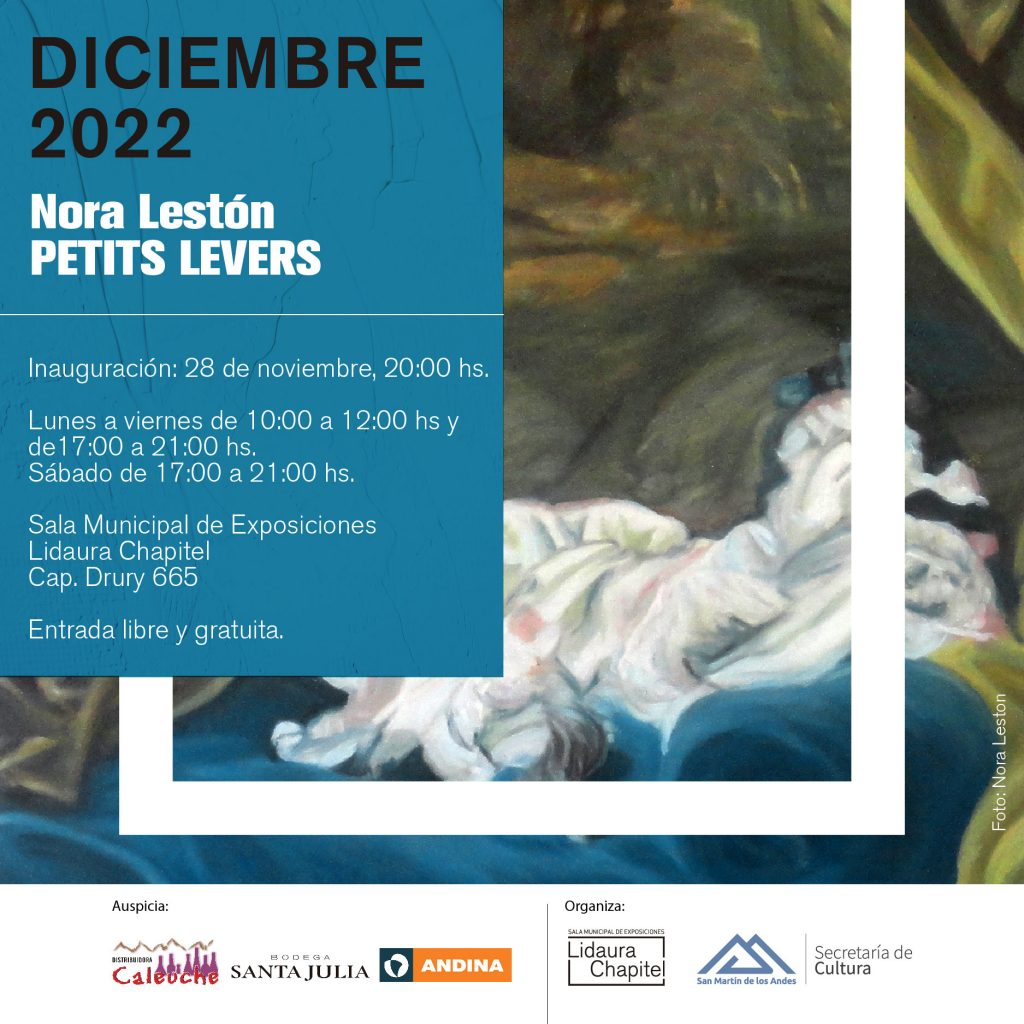 La exposición ”Petit Levers”, de Nora Lestón de pinturas y objetos, inaugurará este lunes 28 de noviembre, a las 20 hs. y estará vigente hasta el 19 de diciembre.