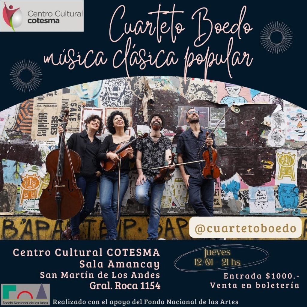 El próximo jueves, 12 de enero de 2023, a las 21hs, en la Sala Amankay de nuestro querido Centro Cultural, el Cuarteto Boedo presenta “MÚSICA CLÁSICA POPULAR”.