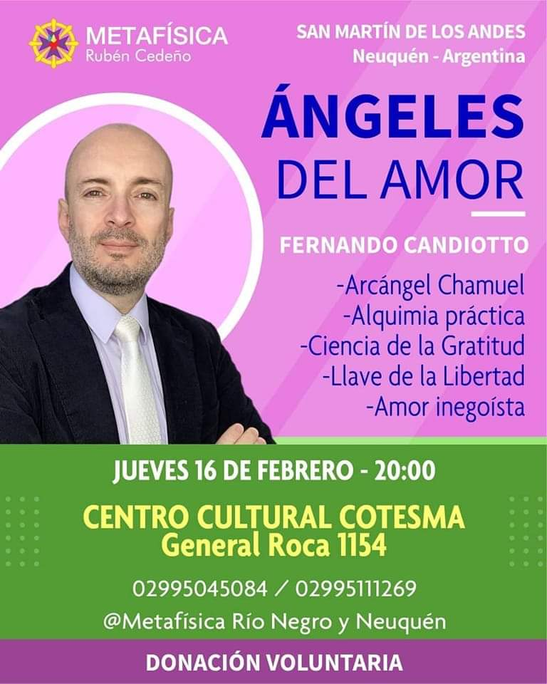 EL jueves 16 de Febrero en nuestra sala Günther Blaas, tendremos una charla de Metafísica a las 20hs a cargo de Fernando Candiotto. La actividad comienza puntual. Los esperamos a todos. METAFÍSICA – Enseñanza Interna ACTIVIDAD PRESENCIAL “ÁNGELES DEL AMOR” -Arcángel Chamuel-Alquimia práctica-Ciencia de la Gratitud-Llave de la Libertad-Amor inegoísta Por Fernando Candiotto ✅JUEVES 16 DE FEBRERO DE 2023 🕔20 H. CENTRO CULTURAL COTESMAGeneral Roca 1154San Martín de los AndesProv. de Neuquén. Argentina Información:Facebook: Metafísica Río Negro y Neuquén Instagram: @metafisicarionegroyneuquén WhatsApp 2995045084/ 2995111269Mail: lolyferrero@hotmail.com La actividad comienza puntualmente. 🔸DONACIÓN AMOROSA:Estas actividades se sostienen con la colaboración voluntaria y espontánea de los participantes, a través de la Donación Amorosa.Agradecemos como siempre la difusión del evento.