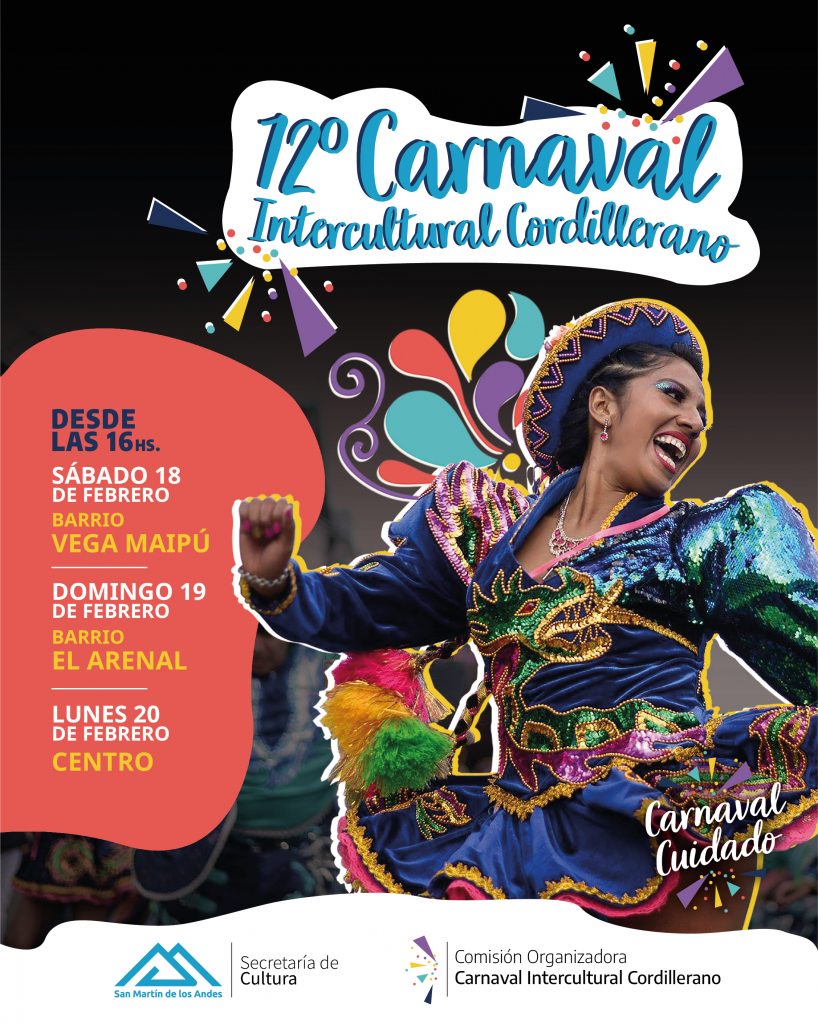 Desde el sábado 18 al lunes 20 de febrero viviremos una nueva edición del Carnaval Intercultural Cordillerano, uno de los acontecimientos culturales más convocantes de nuestra localidad, que contará con la participación de murgas, caporales, batucadas y comparsas, de San Martín de los Andes y de otras localidades de la región y el país.