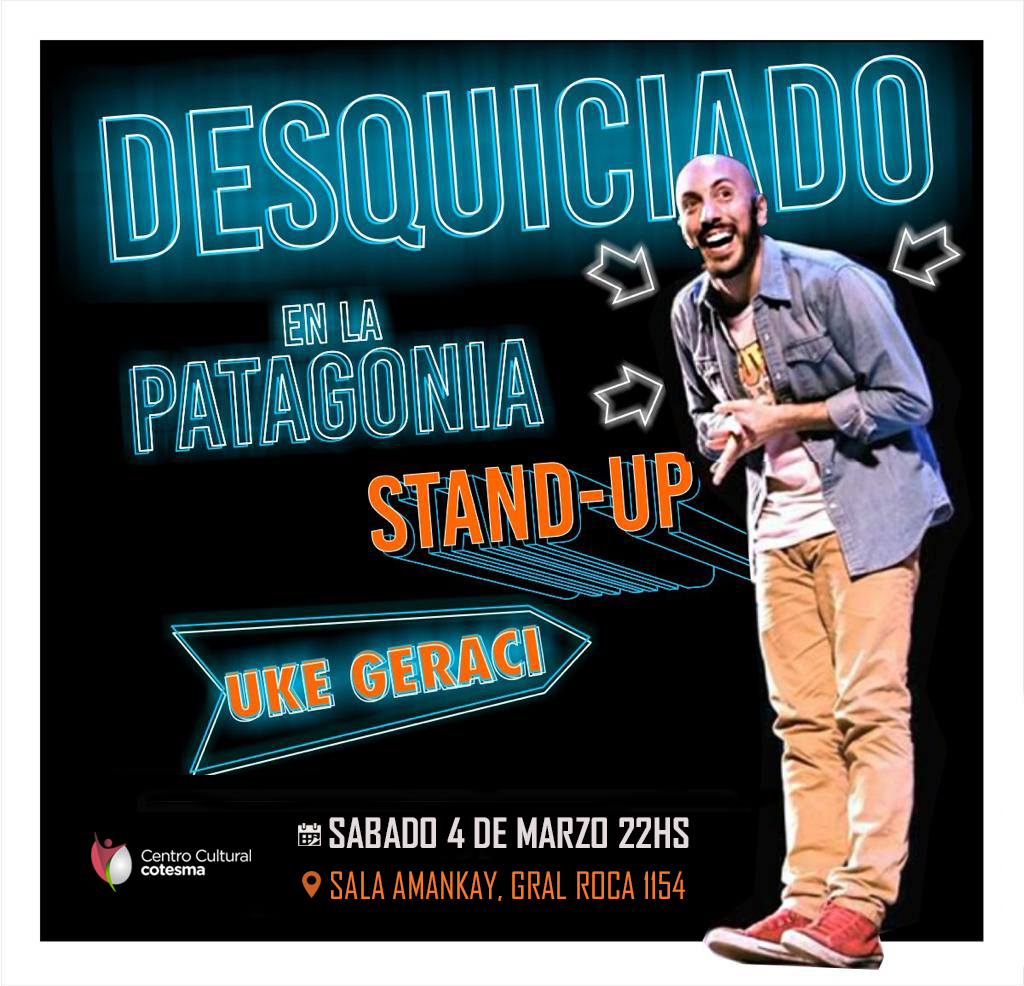 El próximo sábado, 04 de marzo, a las 22hs, en nuestra querida Sala Amankay, vamos a disfrutar una divertidísima noche de Stand Up junto a Uke Geraci y su imperdible “DESQUICIADO EN LA PATAGONIA”.