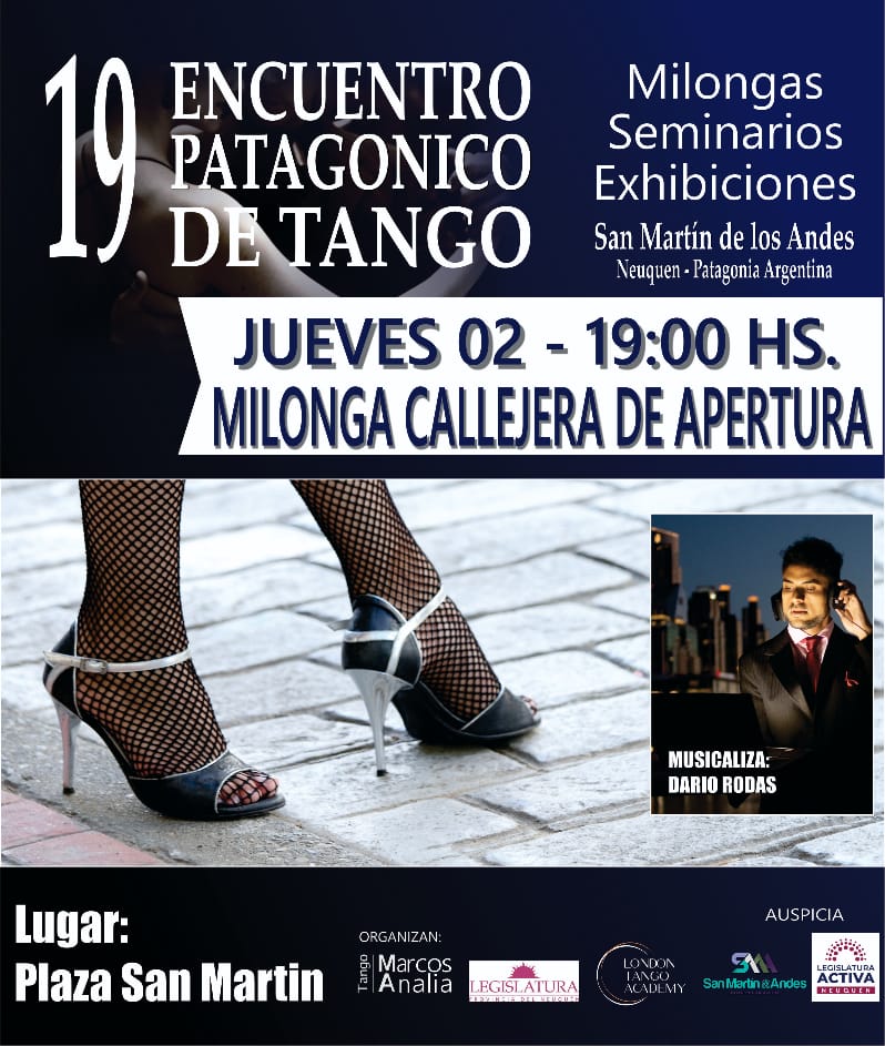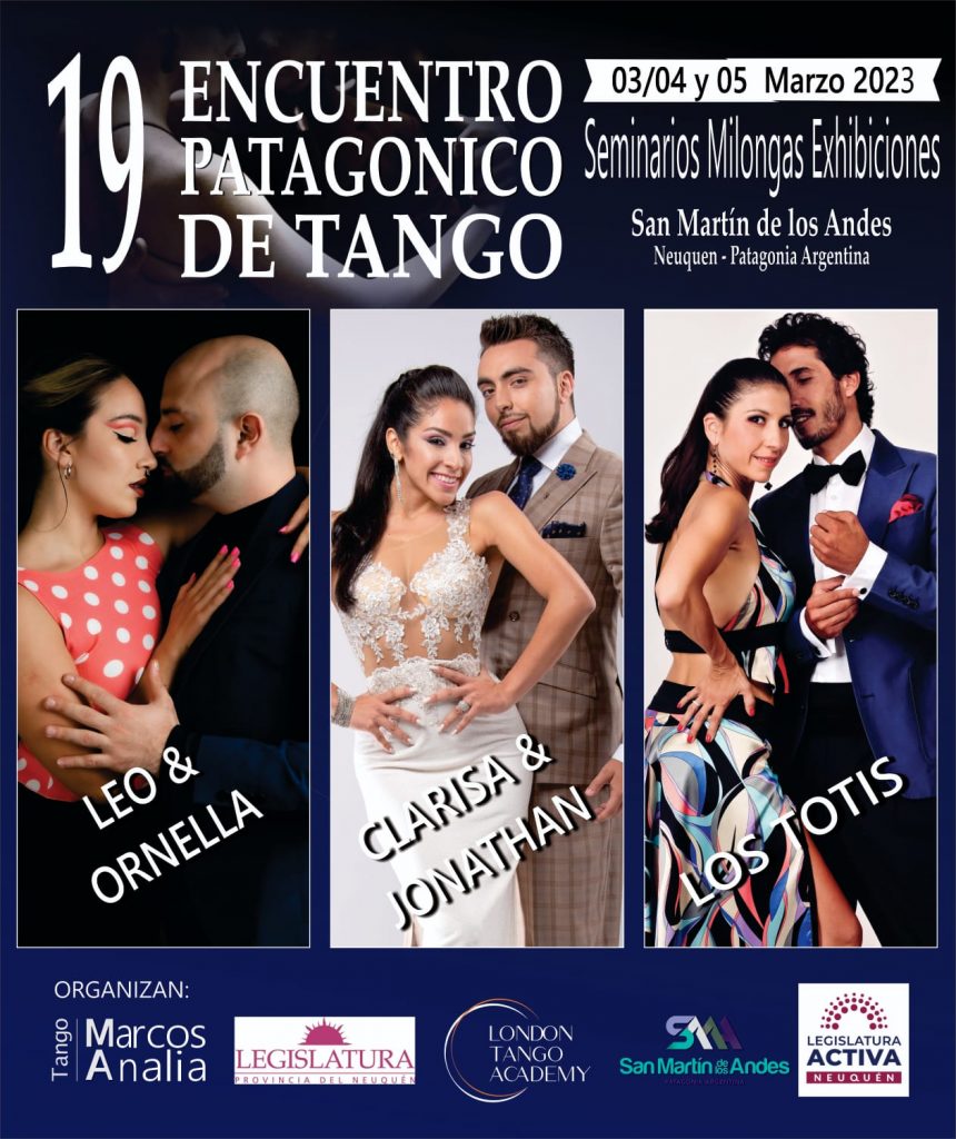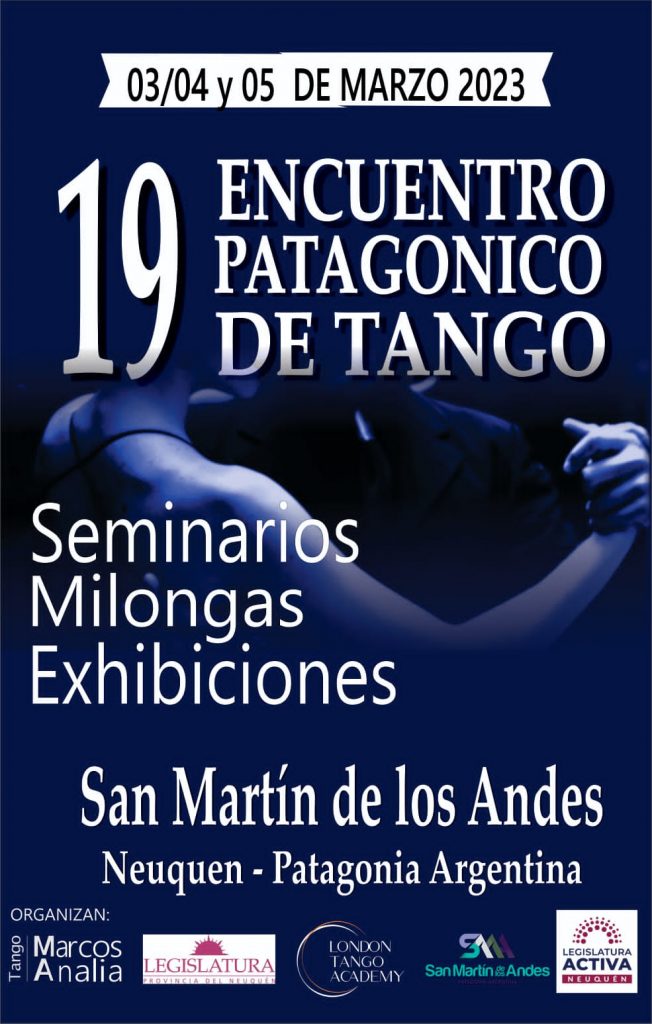 El Encuentro Patagónico de Tango, que se realiza en la ciudad de San Martin de los Andes, Organizado por los Maestros Bailarines Marcos O. Aviles y Analia Beatriz Braun, desde hace 18 años, es Festival de Tango de Mayor trayectoria de la Patagonia. Este año 2023 en su 19 Edición se llevara a cabo los días 02, 03, 04 y 05 de Marzo.